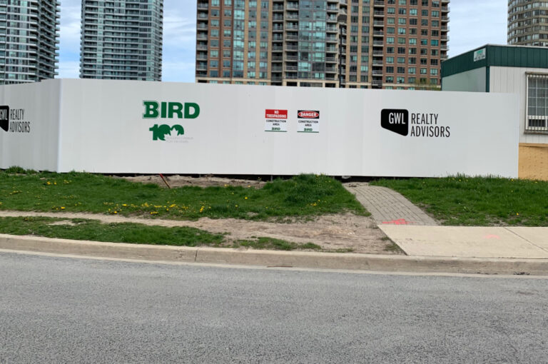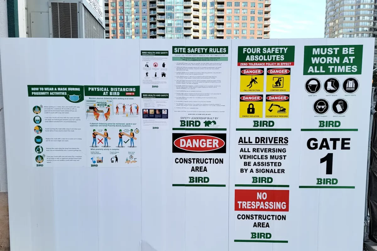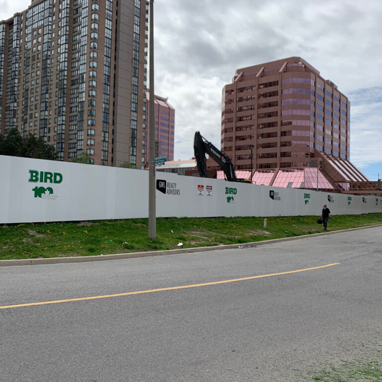 The site was securely enclosed with Greenloc panels and branded graphics were applied to the panels. To align with the clients’ sustainability goals, the Greenloc PVC panels will be checked for quality control before being stored and reused at a different project. This process maximizes the amount of reused and recycled content at the construction site, in addition to decreasing plywood waste.