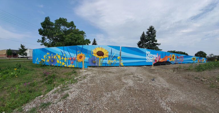 New to North America, the curved hoarding technology allows the Greenloc panels to follow the natural curve of the landscape. The PVC panels are flexible and strong enough to create a variety of angles to create the “curved” effect without compromising the safety and quality of the hoarding. The Greenloc panels provide a smooth canvas for artists to create immersive paintings that told the story of the community. Vinyl graphics with marketing messages were applied directly to the surface of the panels, without the need for additional materials.