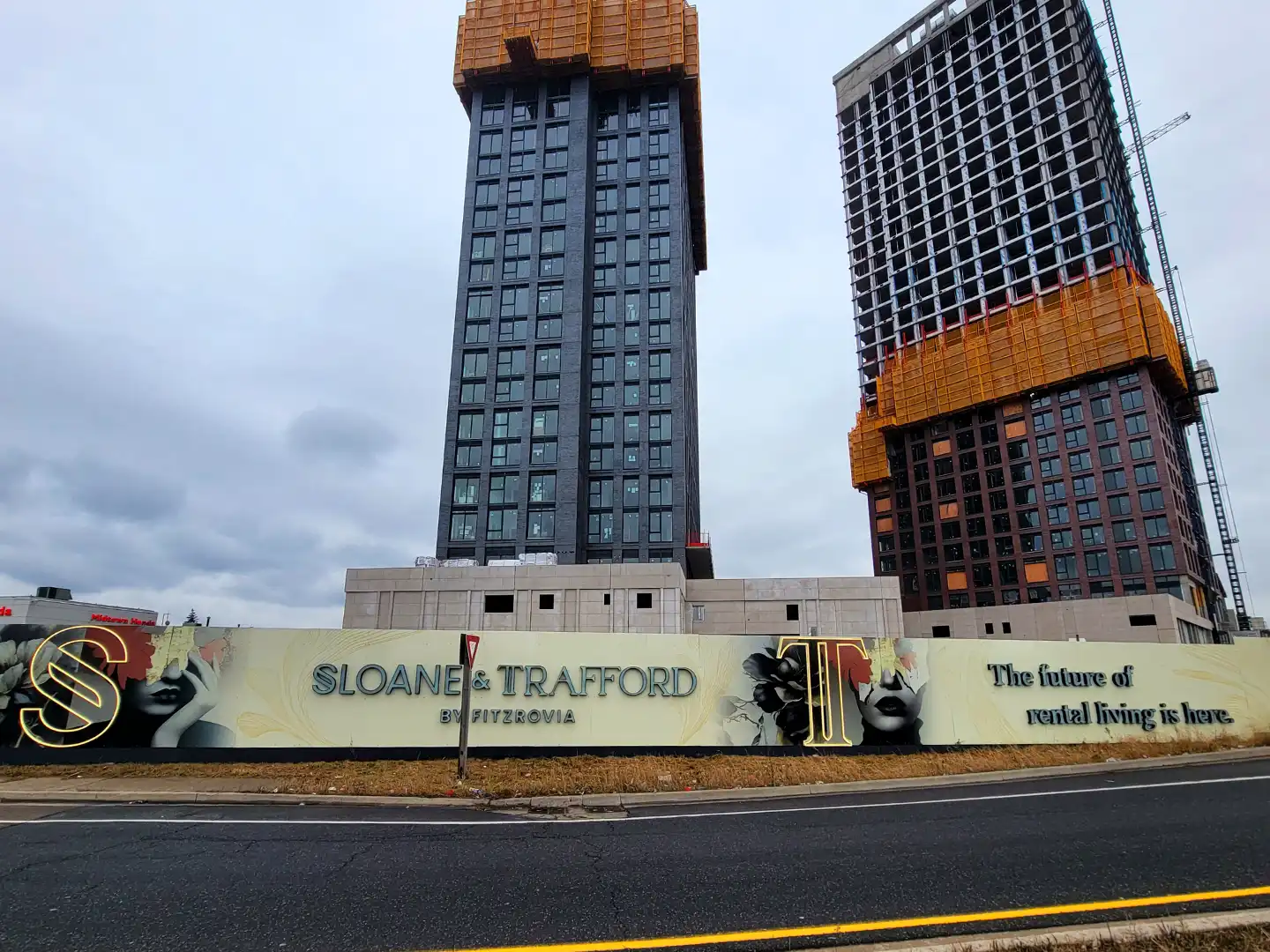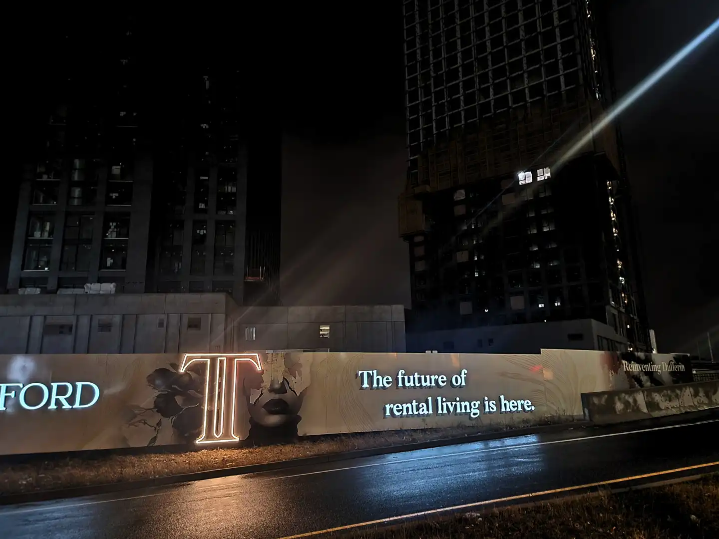 Customized construction hoarding by Greenloc surrounds this mixed-used rental space development using 3D channel lit letters mounted on aluminum panels.