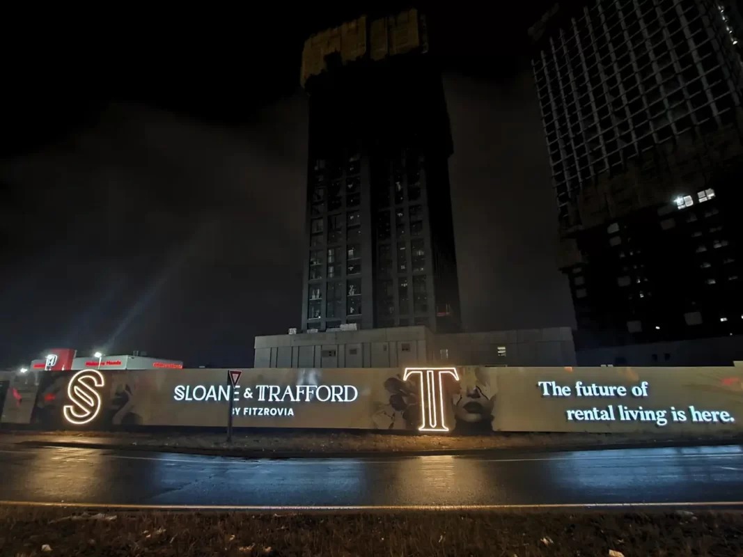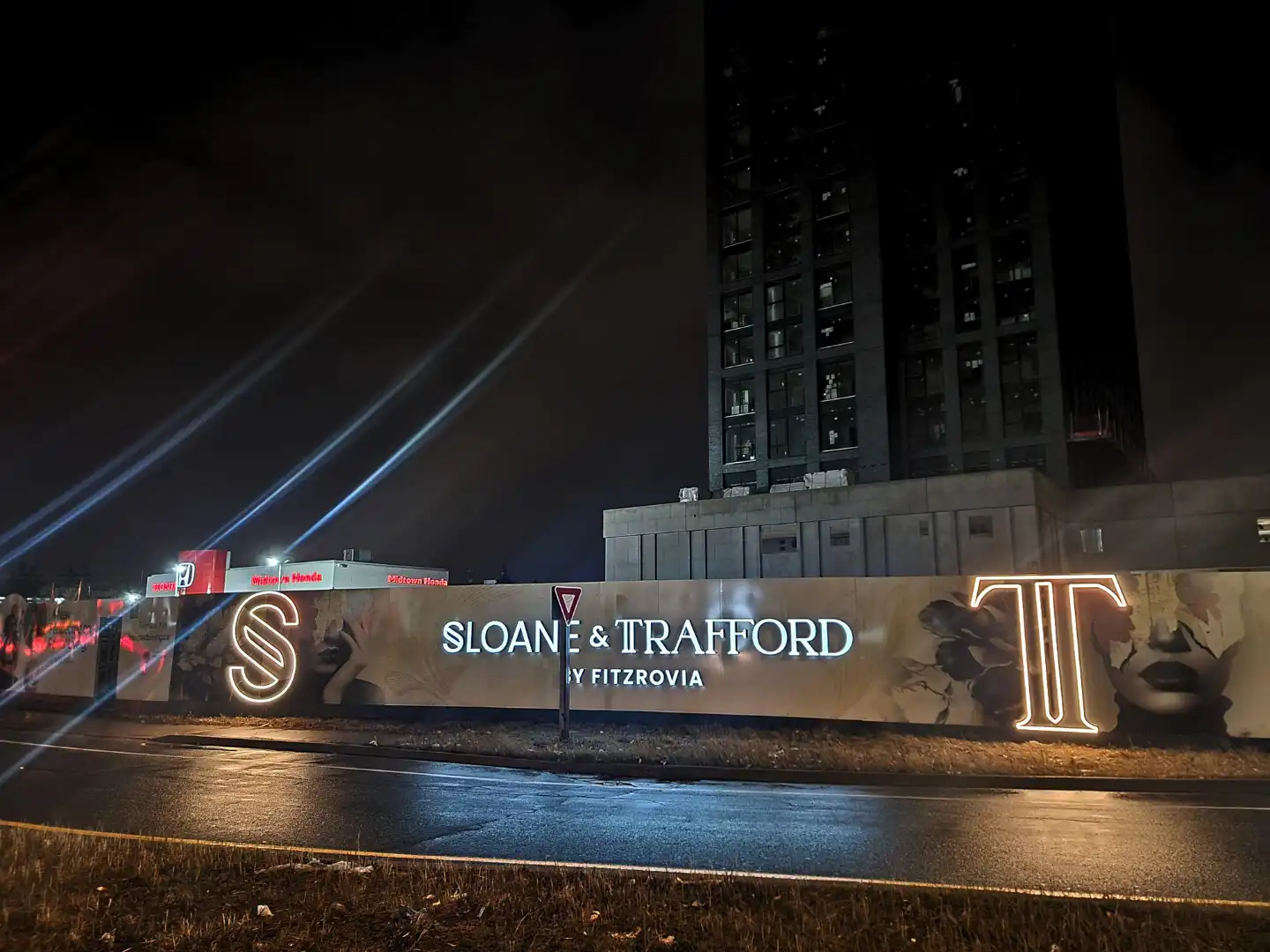 Greenloc produced this striking construction site hoarding using channel lit letters for a new development by Fitzrovia Real Estate.