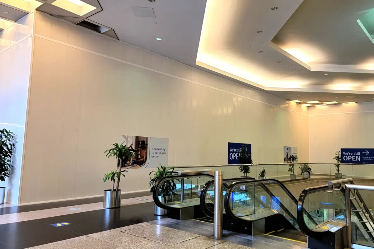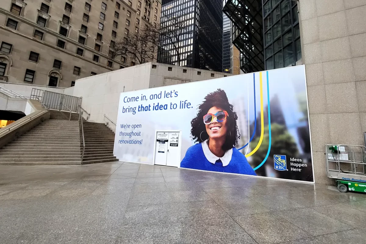 The result? The hoarding was easily flipped it around, showing the pristine blue RBC graphics on the customer-facing side, while the construction would carry on the backside of the wall.